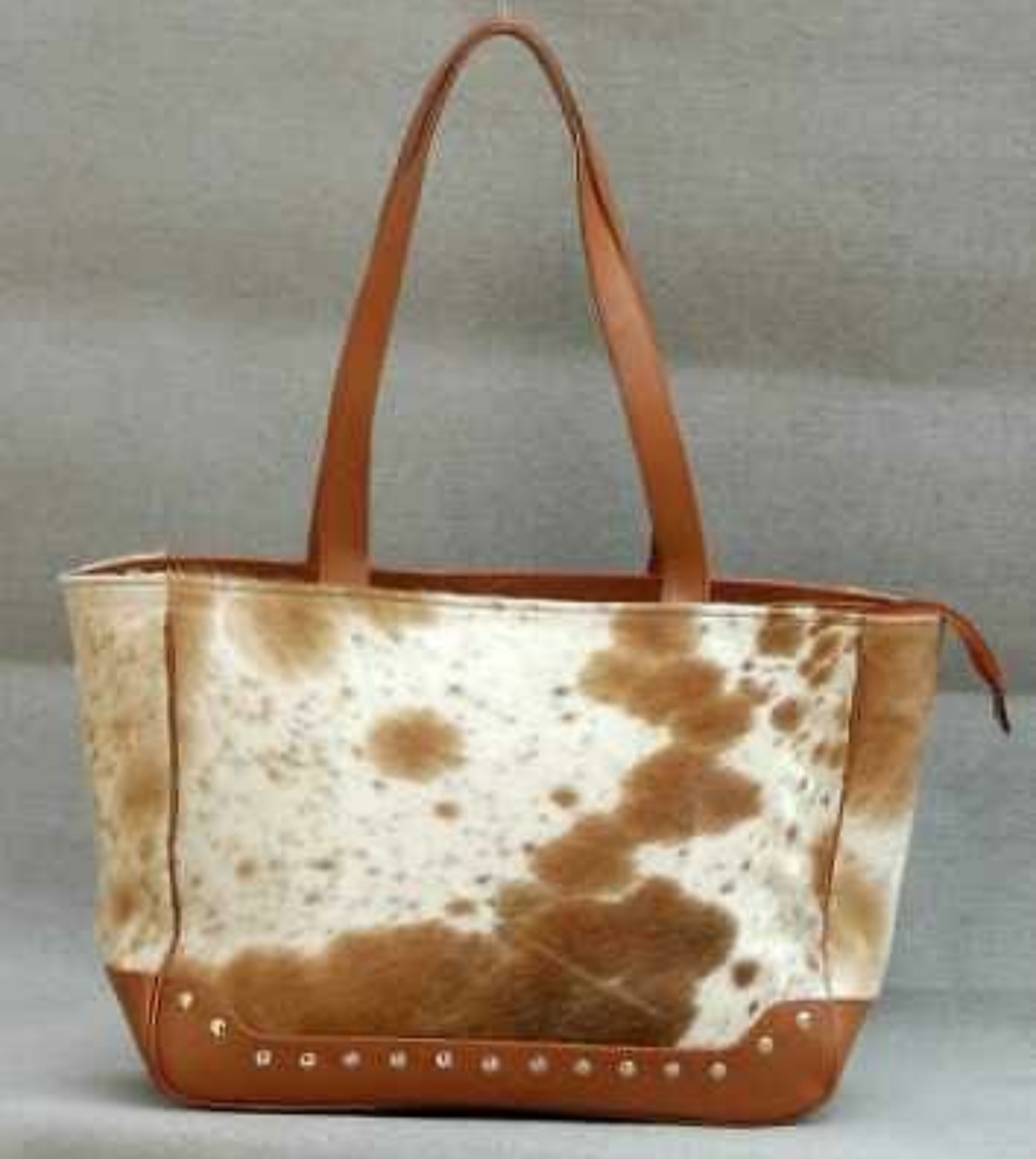Elegant beige cowhide tote with brown leather handles. Durable and spacious for daily essentials with a rustic western charm.