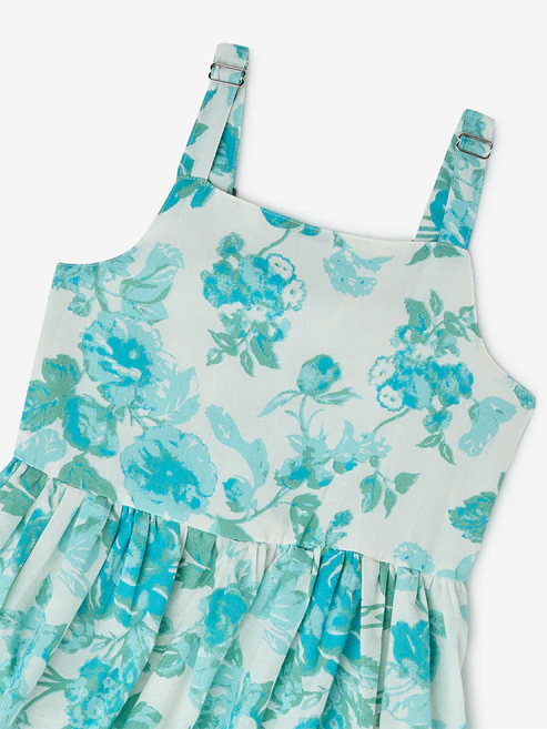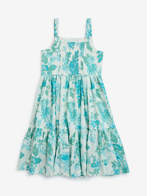 Utsa Kids Aqua Floral Pattern Cotton-Blend Tiered Dress – (8-14yrs)